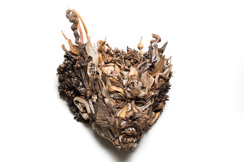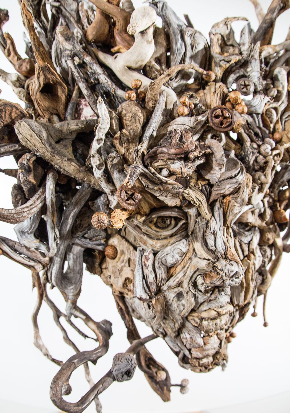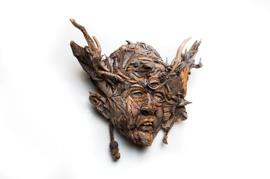 Bonded with glue and reinforced with epoxy, the sylvan entities and their expressions of thought and emotion portray a glimpse of an otherworldly realm that is not altogether unfamiliar. His technique ranges from smooth and spiralling to rough and jagged, blending fantasy with reality and impressionism with ornate design – an effect that might be something along the lines of abstract realism.